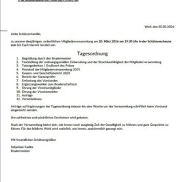 Liebe Schützenfamilie, wir laden Euch herzlich zur diesjährigen ordentlichen Mitgliederversammlung ein. Die Versammlung findet statt...
