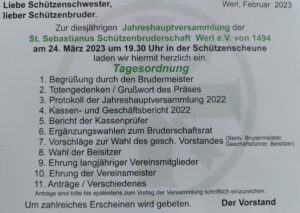 Zur diesjährigen Jahreshauptversammlung der St. Sebastianus Schützenbruderschaft Werl e.V. von 1494 am 24. März 2023 um 19.30 Uhr in der Schützenscheune laden wir hiermit herzlich ein.