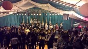 Vor dem Höhepunkt des Abends, dem Großen Zapfenstreich, wurde in einer bewegenden Zeremonie die Hauptfahne übergeben und die neuen Majestäten gekrönt. Während seinen dankenden Abschiedsworten konnte Werner Falkenhain und auch viele der Schützen auf der Bühne die Tränen nicht ganz zurückhalten. Ebenso ergreifend waren auch die kurzen Antrittsworte des neuen Königs, der noch ein mal die aus eigener Erfahrung wichtige Jugendarbeit im Verein unterstrich und dazu aufforderte, die Bruderschaft hier besonders zu unterstützen.