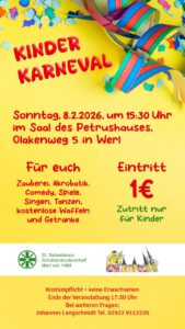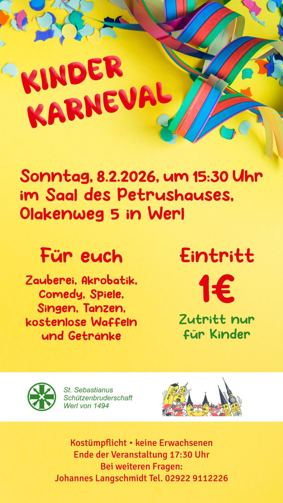s in Werl in eine kunterbunte Karnevalswelt – exklusiv für Kinder! Die St. Sebastianus Schützenbruderschaft Werl von 1494 lädt herzlich ein zum großen Kinder Karneval.