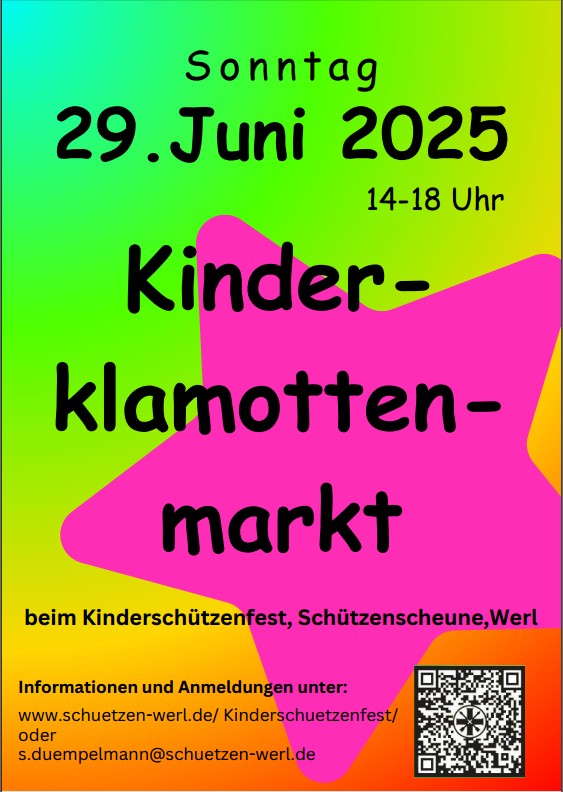 Wer Interesse hat, dort seine Kinderkleidung oder Spielsachen zu verkaufen, kann sich bei s.duempelmann@schuetzen-werl.de oder auf dem Formular auf der Internet Seite www.schuetzen-werl.de anmelden. Die Standgebühr beträgt pro Anmeldung für max. 3 Meter Fläche 10 Euro. Dieses wird wieder zurückfließen an die Kinder- und Jugendarbeit der Schützenbruderschaft.