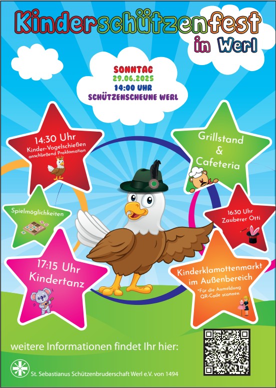 die St.Sebastianus Schützenbruderschaft Werl lädt alle Kinder und ihre Familien herzlich zum Kinderschützenfest am 29.06.2025 ein.