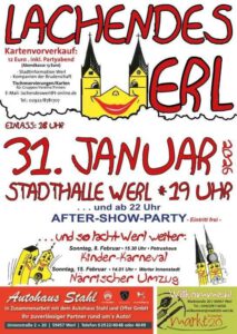 Werl lacht wieder – und wie! Am Freitag, den 31. Januar 2026 startet das große Karnevalsfest „Lachendes Werl“ in der Stadthalle Werl. Freut euch auf ein buntes Programm, ausgelassene Stimmung und eine legendäre After-Show-Party!