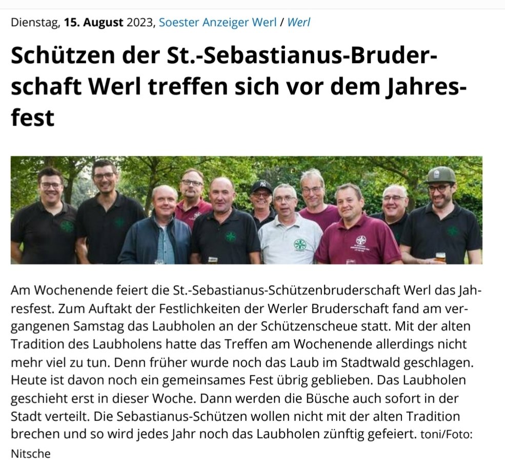 Am Wochenende feiert die St.-Sebastianus-Schützenbruderschaft Werl das Jahresfest. Zum Auftakt der Festlichkeiten der Werler Bruderschaft fand am vergangenen Samstag das Laubholen an der Schützenscheue statt. Mit der alten Tradition des Laubholens hatte das Treffen am Wochenende allerdings nicht mehr viel zu tun. Denn früher wurde noch das Laub im Stadtwald geschlagen. Heute ist davon noch ein gemeinsames Fest übrig geblieben. Das Laubholen geschieht erst in dieser Woche. Dann werden die Büsche auch sofort in der Stadt verteilt. Die Sebastianus-Schützen wollen nicht mit der alten Tradition brechen und so wird jedes Jahr noch das Laubholen zünftig gefeiert. toni/Foto: Nitsche
