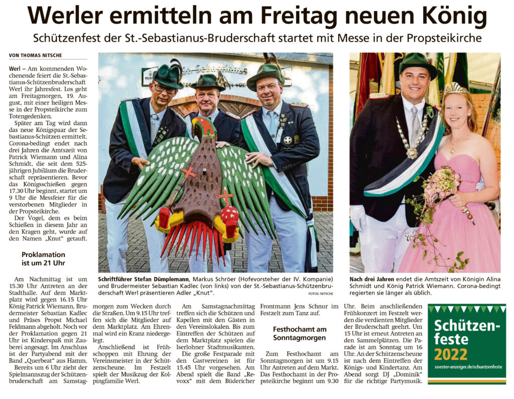16 Aug. 2022 Soester Anzeiger vom 16. August 2022 von Thomas Nitsche | Veröffentlicht in: Presseartikel | 0 Vorankündigung Schützenfest Bereits 0 Mal geteilt. Danke!teilen teilen teilen