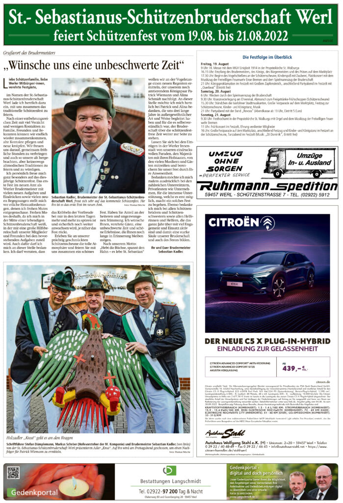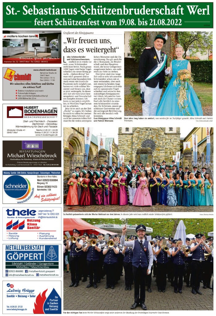 18 Aug. 2022 Soester Anzeiger am 18. August 2022 von Thomas Nitsche | Veröffentlicht in: Presseartikel | 0 Sonderbeilage zum Schützenfest Bereits 0 Mal geteilt. Danke!teilen teilen teilen