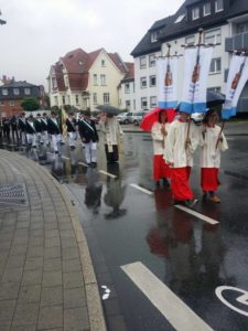 Am vergangenen Wochenende fand im Rahmen der Wallfahrtssession um 7:00 Uhr die jährliche Stadtprozession durch die Innenstadt von Werl statt. Zu diesem Ereigniss sind auch immer zahlreiche Pilger aus nah und fern zu Gast in der Wallfahrtsstadt. Traditionell wurde durch eine kleine Delegation, stellvertretend die Wallfahrer aus Much an der Alten Windmühle abgeholt und zur Kirche begleitet. Trotz des ungünstigen Marschwetters kamen alle Pilger zwar erschöpft aber glücklich an. Zum Abschlussgebet versammelten sich alle Pilger in der Wallfahrtsbasilika.